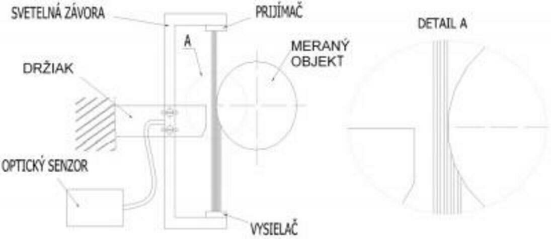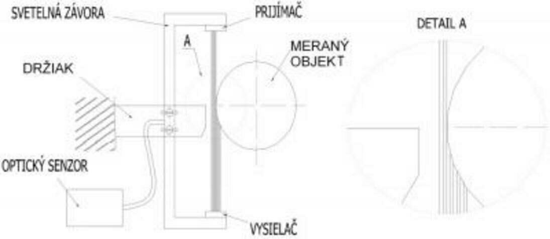 Svetelná závora je tvorená vysielačom a prijímačom, ktoré sú pripevnené oproti seba v optickej osi na držiaku, ktorý je skrutkami spojený s pevnou predlženou úchytkou. Držiak sa dá jednoducho, pomocou skrutiek nastaviť, tak aby optická os medzi vysielačom a prijímačom bola presne nastavená na miesto snímania. Prijímač svetelnej závory je umiestnený na hornej časti držiaka, aby nedochádzalo k rušeniu z okolitého vonkajšieho svetla.