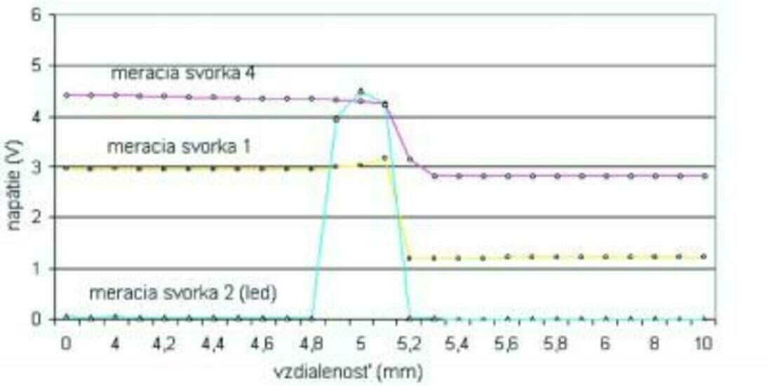 Pri tomto meraní bola experimentálne overená funkčnosť optického senzora postupným zatieňovaním svetelného lúča medzi vysielačom a prijímačom pri dvoch veľkostiach prierezu štrbiny clony 2 a 3 mm. Meranie vychádzalo z oživenia optického senzora pripojením na zdroj elektrickej energie. Ako zdroj bola použila 4,5voltová batéria. Po oživení a skontrolovaní základných funkcií sa optický senzor prepojil so svetelnou závorou. Ako zatieňovacie teleso, ktoré nahrádza meraný objekt pri kontrole, bolo požité posuvné meradlo z dôvodu presnosti merania vzdialenosti pri zatieňovaní svetelného lúča. Pred samotným meraním bolo veľmi dôležité nastaviť správnu citlivosť senzora, a to zväčšovaním a zmenšovaním odporov pomocou potenciometrov. Prvé meranie sa prevádzalo pri priereze štrbiny clony 3 mm. Posuvné meradlo sa nastavilo na rozmedzie 10 mm. Zmenšovaním tejto hodnoty po krokoch sa postupne zatieňoval svetelný lúč. Po každom kroku sa odmeralo napätie na jednotlivých svorkách a hodnoty sa zapísali do tabuľky. Ako vidieť z grafu, pri hodnotách vzdialenosti 4,9, 5,0 a 5,1 mm došlo k takému zatieneniu svetelného lúča, že sa rozsvietila dióda na optickom snímači, čo by malo za následok prudkú zmenu hodnoty meranej veličiny. Týmto spôsobom sa namerali hodnoty pri priereze štrbiny clony 2 a 3 mm. Z nameraných hodnôt boli vygenerované nasledovné grafy (obr. 5 a 6).