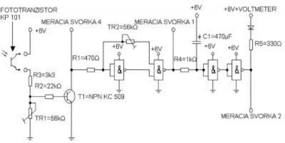 Pri návrhu optického snímača sa dbalo na jednoduchosť a miniatúrnosť, t. j. aby na jeho vyhotovenie bolo potrebných čo najmenej súčiastok. Z tohto dôvodu boli použité integrované obvody obsahujúce zlúčené viaceré súčiastky na jednom čipe. Na základe týchto požiadavkov bola navrhnutá schéma zapojenia optického snímača (obr. 4). Ako vstupný obvod je použitý snímač pracujúci na princípe napäťového deliča tvoreného jednou časťou vysoko citlivým snímacím prvkom (fototranzistor KP 101). Ďalšia časť je tvorená potenciometrom, ktorý umožňuje plynule meniť hodnotu napätia na báze tranzistora T1 podľa potreby. Tento vstupný obvod tvorí zosilňovací stupeň, z ktorého signál je vedený do regulátora. Funkcia regulátora spočíva v porovnávaní vstupného signálu s pevne nastavenou hodnotou a vyslaním signálu pri prekročení tejto hodnoty. Ochranná funkcia voči poruchovému stavu v prípade úplného zatienenia clony je zabezpečená vetvou tvorenou trimrom TR2, ktorá vyradí regulátor z prevádzky. Po zohľadnení požadovaných vlastnosti elektrického obvodu splňujúceho predpokladané kritériá bol navrhnutý príslušný plošný spoj.