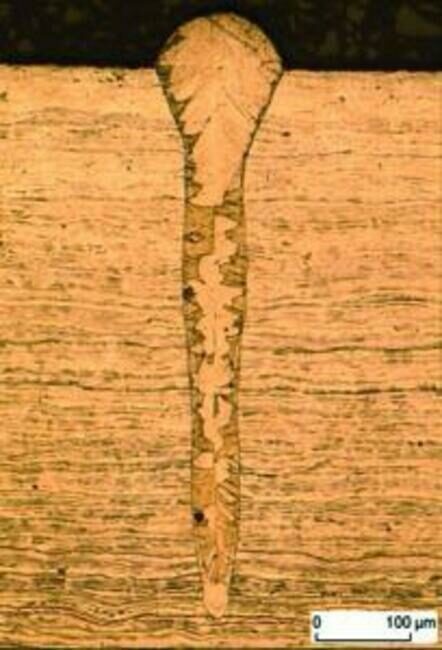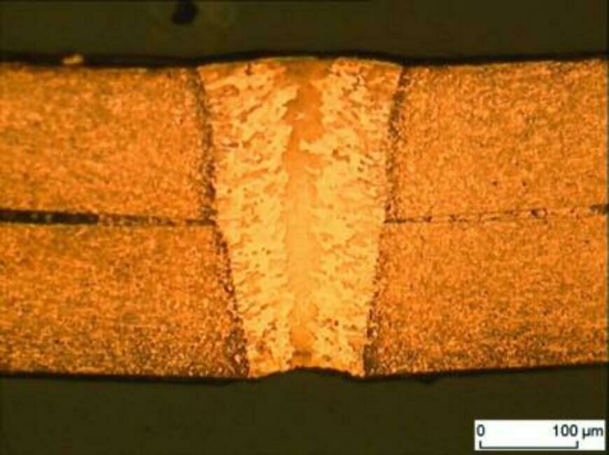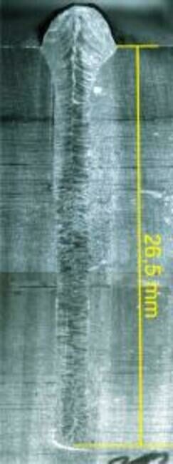Na obr. 4 jsou pak řezy dvou svarů dosažených tímto laserem. Jedná se o svařování nerezové oceli 1.4301. Jak je vidět, tak svařováním ze dvou stran lze dosáhnout hloubky průvaru až 50 mm. Na těchto obrázcích jsou znázorněny aplikace spíše z té horní úrovně dosahovaných výkonů. Vláknové lasery se však s úspěchem používají v celé škále tloušťek a použitých materiálů. Používají se též ve stále širším nasazení i v mikrosvařování a svařování „běžných" tloušťek. To je dáno též poměrně širokou výkonovou řadou strojů, od jednotek wattů až po desítky kilowatů. Na obrázku 5 jsou pak řezy mikrosvarů pro různé materiály.