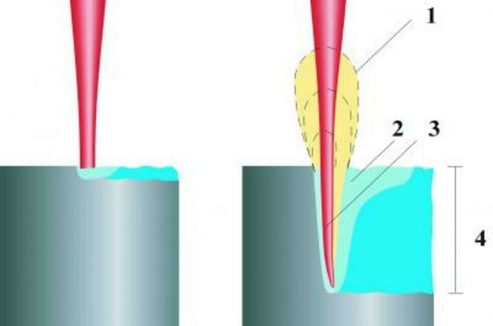 Na obr. 1 jsou naznačeny dva základní principy laserového svařování. Při svařování vedením tepla se materiál taví absorpcí a vedením tepla vyvolaného laserovým svazkem. Tento postup umožňuje svařování jen do malých hloubek. Zvyšováním plošné hustoty výkonu dosáhneme kritické hodnoty (empiricky 1 až 5 x 106 W/cm2), při které se materiál začíná odpařovat, generuje se plazma a začíná docházet k hlubokému provařování. Laserový paprsek vytvoří „kapiláru", která má průměr 1,5- až 2násobek průměru ohniska. Uzavření této kapiláry je zabráněno tlakem plynů. Energie ze stěn kapiláry potom vniká do taveniny a okolního tuhého materiálu. Svařováním do hloubky je umožněno zvýšení efektivity svařování. Vlastní proces a jeho stabilita je závislá na svařovaném materiálu, polarizaci, vlnové délce laseru, rychlosti posuvu a mnoha dalších faktorech.