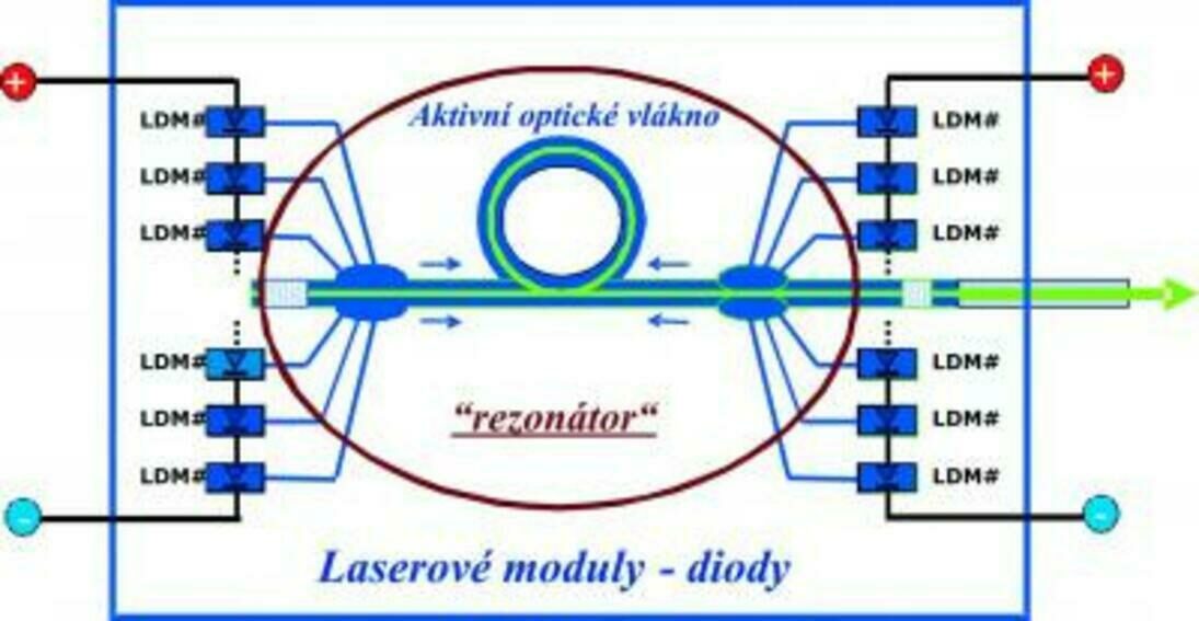 Velkou výhodou vláknových laserů je podstatně vyšší účinnost, tzn. podstatně menší spotřeba elektrické energie, nižší nároky na chladicí okruh a výrazně menší půdorysné rozměry. Všechny tyto skutečnosti samozřejmě vedou k dramatickému snížení provozních nákladů. Na obr. 2 je typické schéma výkonového vláknového laseru. Výkon z budicích laserových diod je přímo navázán do aktivního vlákna rezonátoru.