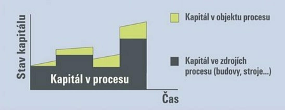 Stavy kapitálu v jednotlivých fázích procesu na vyráběném dílu, například operacích, se mění; v případě zdrojů procesu skokově kolísají, v případě samotného dílu v průběhu fází lineárně rostou, přičemž tempo růstu v jednotlivých fázích je různé. Schematickyto ve zjednodušené formě ilustruje obr. 4.