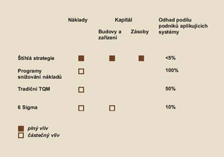 Nejsložitější, ale zpravidla neúčinnější je tzv. štíhlá výroba, v širším pojetí štíhlá strategie, vzniklá v Toyotě a nesčetněkrát oceněná i popsaná v literatuře. Jen málo dalších podniků ji však dokázalo implementovat. Tato strategie snižuje kapitálové nároky výroby, ale zdánlivě – v tradičních nákladových kalkulacích – zvyšuje náklady. Proto, údajně, došlo k ostrým střetům architekta výrobního systému Toyoty Taichiho Ohna s nákladovými účetními a k jejich vyhození z provozu. Řešení spočívá ve správných výpočtech nákladů, což vyžaduje koncepční změny tradičních kalkulací.