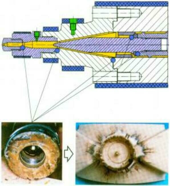 Za předpokladu kvalitní konstrukce vstřikovací a uzavírací jednotky a bezvadné funkce řídicího systému bývá nejčastějším zdrojem vad opotřebení funkčních částí vstřikovací jednotky (uzávěr šneku nedokonale těsní, na přední části, zejména u trysky, jsou mrtvé kouty, v nichž dochází k degradaci polymeru, dosed trysky není dokonalý - tryska podtéká a výstřik nelze snadno vyhodit z formy). Příklady takové vady jsou na obr. 1 a obr. 2. V případě, že je poruchové topení jednotlivých pásem vstřikovací jednotky, nastává teplotní a viskozitní nehomogenita v dávce taveniny, což také vede k vadám výstřiku.