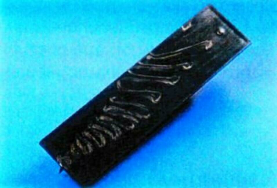 Stopy po volném proudu taveniny (obr. 9) vznikají při nevhodné konstrukci a umístění vtoku, a to zejména u amorfních termoplastů (např. ABS). Opět se setkáváme s kombinací vady vzhledové spojené s menším pevnostním zeslabením výstřiku v důsledku sekundárního studeného spoje. Tato vada je spojena s umístěním vtoku obvykle do čelní plochy výstřiku (obr. 10). Proud taveniny (zejména při pomalé rychlosti vstřikování) volně postupuje středem tvarové dutiny a zastaví se u protilehlé stěny nebo při dosažení nějaké překážky. Potom teprve následuje zaplnění celé tvarové dutiny. Prvotní proud taveniny se na povrchu ochladí, a tím vznikne viditelná stopa po volném proudu jako vzhledový defekt. Jedná se tedy o sekundární studený spoj se všemi důsledky.