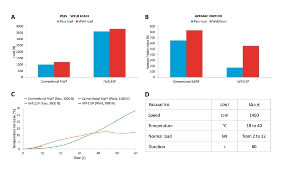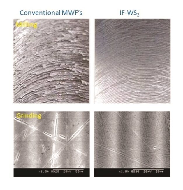 Výsledky testů EP podle DIN 51350 jsou uvedeny na obrázku 6. MWF s IF-WS2 vykazovaly vyšší svarové zatížení ve srovnání s konvenčními MWF. Kromě toho použití IF-WS2 mělo za následek nižší tření ve srovnání s konvenčními MWF. Teplotní profily během EP testu ukázaly, že kapalina s IF-WS2 byla schopna udržovat rozhraní chladnější o 15 °C ve srovnání s konvenčními MWF. Adhezní energie IF-WS2 byla přibližně šestkrát vyšší než u vrstvy tvořené chlorovanými parafiny v konvenčních MWF. Ukazuje, že mazání pomocí IF-WS2 je trvanlivější kvůli silnější adhezi tribolayerů.