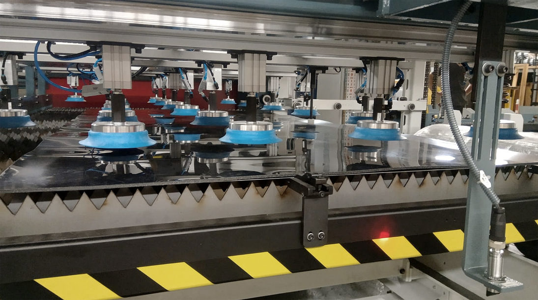 Nakládání plechů je ve standardu řešeno pomocí vakuových přísavek. (Zdroj: Formetal)