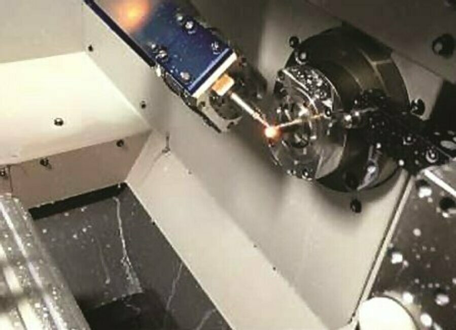 Multifunkční soustružnický stroj Cincom L20 s integrovanou laserovou hlavou (v detailním zobrazení).