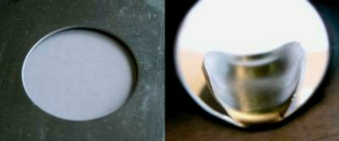 - Tvar díry byl vhliníku vystřižen kompletně (obr. 4 vlevo), při stříhání oceli nastalo, vzhledem kdělenému magnetickému poli, tzv. víčko - krabičkový efekt, tzn. že díra není vyříznuta úplně (obr. 4 vpravo).