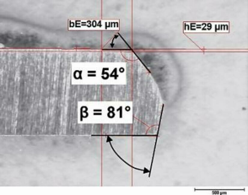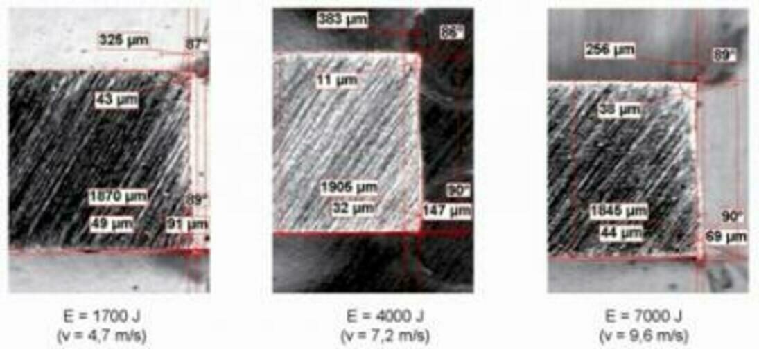 Tyto úpravy umožnily dosáhnout pulzním generátorem 10 kV firmy PST Products GmbH vyšší napájecí proudy a bylo možné řezat úspěšně plechy z materiálu 22MnB5, jak ukazuje obr. 5. Energie působící v příčném řezu cívky činí 19 000 J. Na obr. 6 je ukázán výbrus a jsou uvedeny hodnoty drsnosti naměřené na stříhané ploše. Na obr. 7 je výbrus a hodnoty drsnosti stříhané plochy při použití klasického razníku na zařízení ADIA7.