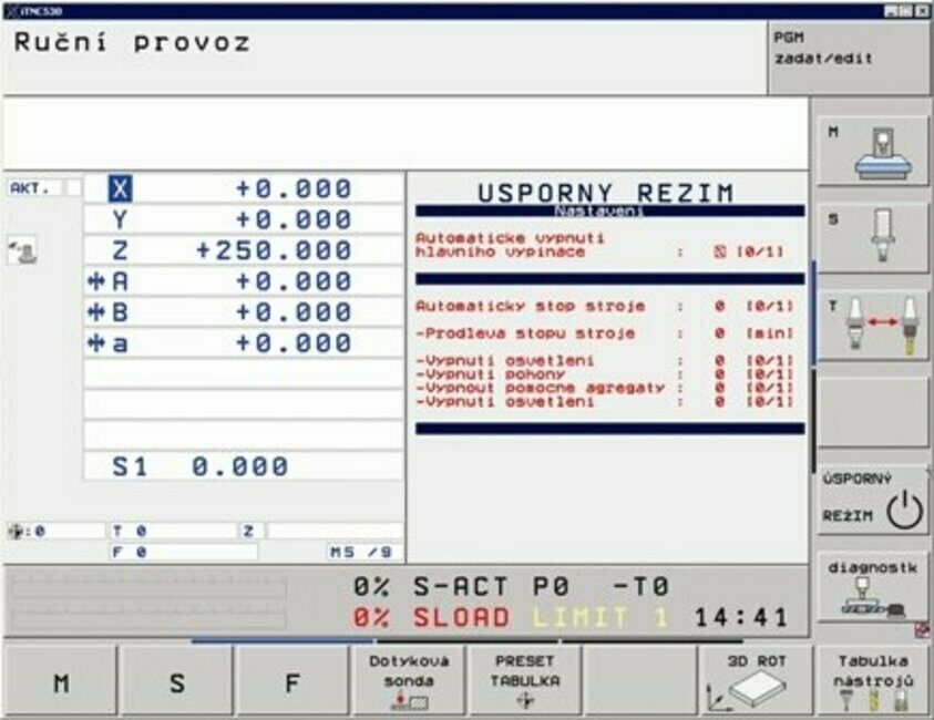 Třetí opatření spočívá v zavedení funkce automatický stop stroje a je analogií dobře známého úsporného režimu, který používají osobní počítače. Funkce je aktivována, pokud je stroj po určitou dobu v klidu. Bylo změřeno, že pokud stroj neobrábí, ale je zapnut, odebírá ze sítě proud cca 6 A, který je třeba na chod napájecích zdrojů, osvětlení pracovního prostoru, činnost pomocných agregátů a regulaci servomechanismů. Obsluha stroje může rozhodnout (s ohledem na charakter práce), zda tuto funkci použije pomocí uživatelské obrazovky – viz obr. 1. Stroj po době nastavitelné v parametrech řídicího systému automaticky odpojí nepotřebné spotřebiče od elektrické energie a odebíraný proud výrazně poklesne, činný příkon se sníží podle velikosti stroje cca o 2 kW.
