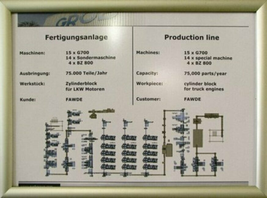 Obráběcí centrum BZ 800 má všechny pohyby v nástroji a obrobek (obrobek spolu s technologickou paletou v případě jiných obrobků) je upnut na otočném stole. Před strojem je umístěn manipulátor palet. Toto uspořádání umožňuje obrábět plochy na čelních plochách bloku motoru. Zakládání obrobků do pracovního prostoru strojů je realizováno manipulátory.