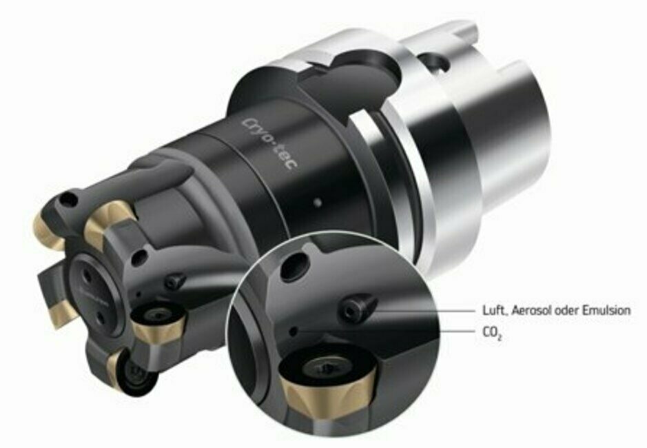 Výsledkem společného vývoje výrobce řezných nástrojů společnosti Walter a výrobce pětiosých obráběcích center firmy Starrag byl vystavený systém kryogenního frézování s chlazením CO2. Pozoruhodné řešení spočívá ve vedení tekutého CO2 strojem, vřetenem, nástrojovým upínačem a nástrojem až k břitu nástroje – a to bez ztráty tlaku a tedy při normální teplotě. K ochlazení na –73 °C dochází až v trysce, když tekutý CO2 začne expandovat. S uvedeným systémem lze obrábět až o 70 % rychleji v porovnání s obráběním za sucha. Přitom chlazení CO2 zajistí dvojnásobné zvýšení trvanlivosti nástroje, za předpokladu nezvýšení řezných parametrů. Zlepšení přineslo i doplnění dalšího kanálku do systému, kterým se přivádí aerosol nebo minimální množství maziva (MQL), např. při frézování vysoce pevných slitin pro silně tepelně odolné turbínové lopatky. Poněvadž jsou obě přiváděná média – CO2 a MQL – zcela oddělená a společně se setkávají až na břitu, dosahuje se vysokého mazacího účinku.