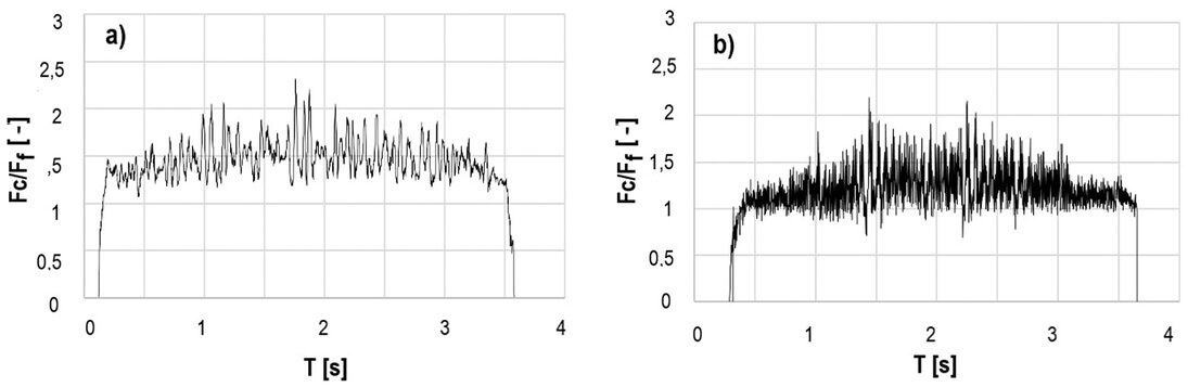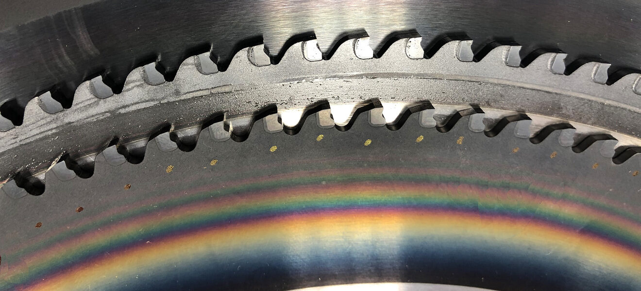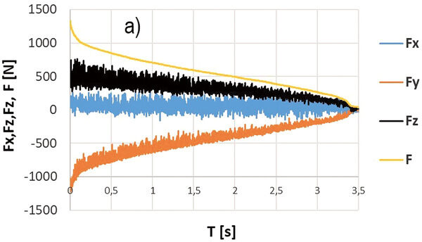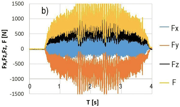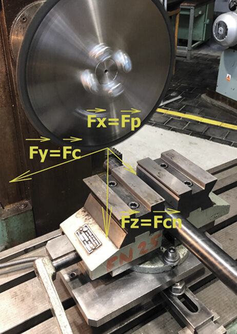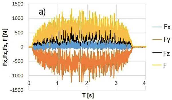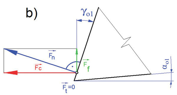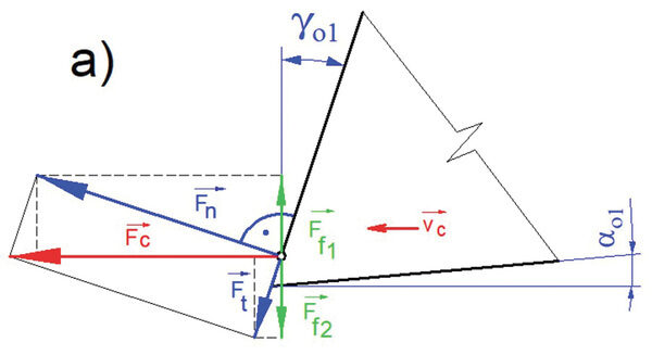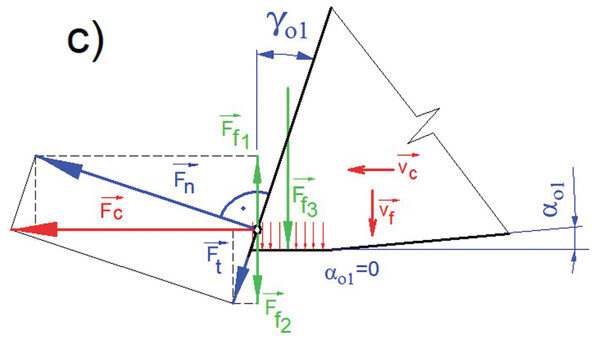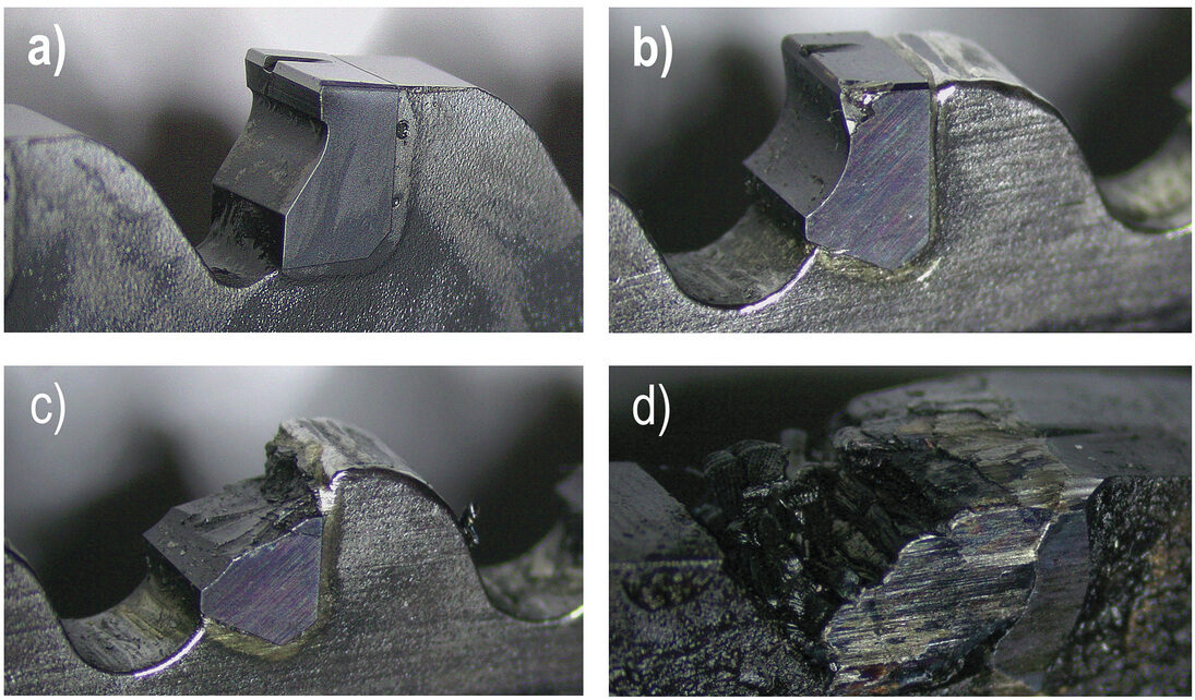Vedle běžného měření základních geometrických parametrů pil a mechanických zkoušek tvrdosti jsou řezné zkoušky nejspolehlivější. Tyto zkoušky odrážejí nejen počáteční řezné vlastnosti ostrého nástroje, ale také rozvoj opotřebení a jeho dopad na další chování nástroje, kvalitu řezu a predikci jeho blízké či vzdálenější destrukce. Řezná geometrie předpokládá zpravidla pozitivní úhly čela a hřbetu, které jí umožňují snadné vniknutí do materiálu. Slinuté karbidy však obsahují nepatrnou fazetu s negativní geometrií čela za účelem zpevnění břitu a zvýšení odolnosti proti lomovému porušení. Pokud je nástroj ostrý a má pozitivní geometrii čela, pak je silové namáhání dominantní ve směru řezné rychlosti, s nízkým přítlakem ve směru přísuvu nástroje (obr. 1a). V případě povlakovaných a vhodně namazaných břitů, kdy se součinitel tření na čele břitu blíží k nule, může být nástroj dokonce do řezu i vtahován (obr. 1b), na pilu tudíž není nutno tlačit. Při opotřebení břitu na hřbetě, případně při zaoblení a jiné degradaci ostří vznikají nepříznivé tvary břitu. Ty pak zvyšují pěchování materiálu namísto jeho odřezání a výskyt pasivních sil, které mohu vyvodit dokonce vyšší silové zatížení, než je ve směru působení řezné rychlosti (obr. 1c). To je v praxi provázeno nevhodným utvářením třísek, uhýbáním nástroje z roviny řezu, případně nepříjemnými průvodními zvuky, které v řadě případů končí i vylomením zubů nebo lomem celého nástroje (obr. 2 a–d). Pro zhoršené podmínky řezu (zpevněné povrchy, přerušované řezy) jsou však tyto zpevňovací fazety (stejně jako děliče třísek) nutné a pak je, i přes nepříznivý poměr sil, důležitá stabilita poměru síly řezné a posuvové. Rovněž třetí ortogonální komponenta, působící axiálně ve směru osy nástroje, může signalizovat porušení symetrie zubu pily nebo jeho částečné vylomení. Analýza řezných sil není jednoduchá, je nutné snímat silové zatížení při pootočení zubů po 1°, ale pomocí tohoto měření a pokročilé statistické analýzy lze získat řadu užitečných průvodních veličin, rozhodujících o kvalitě a nákladovosti výroby.