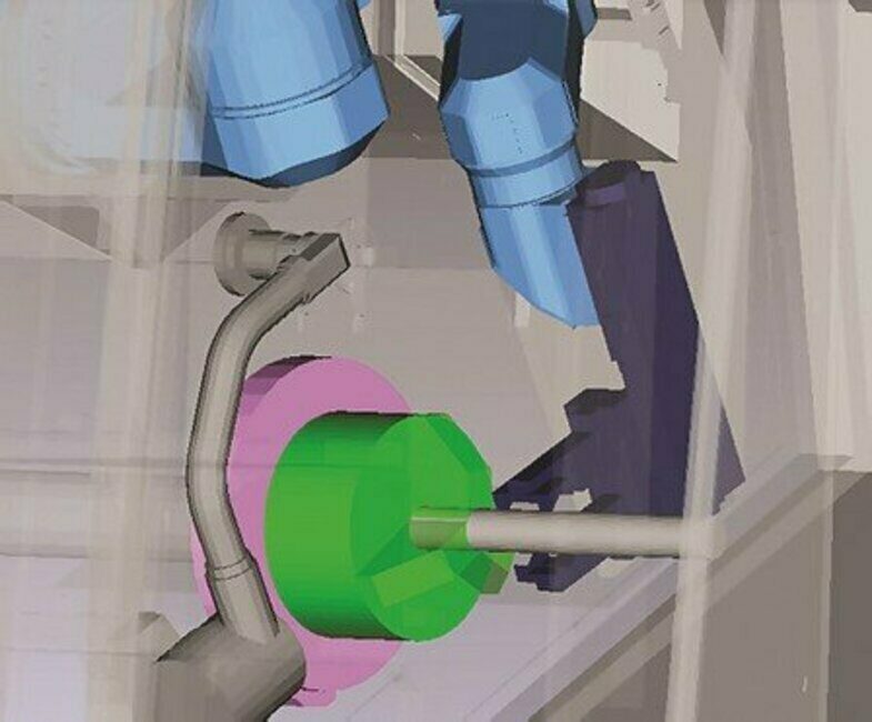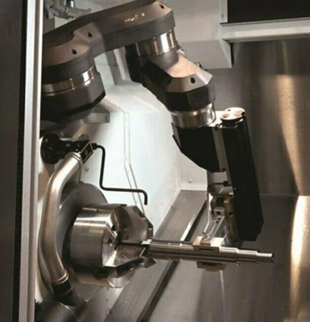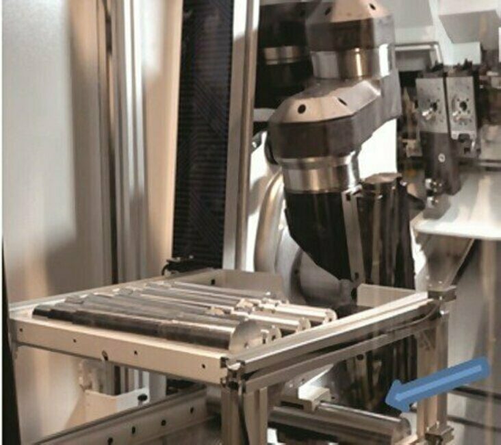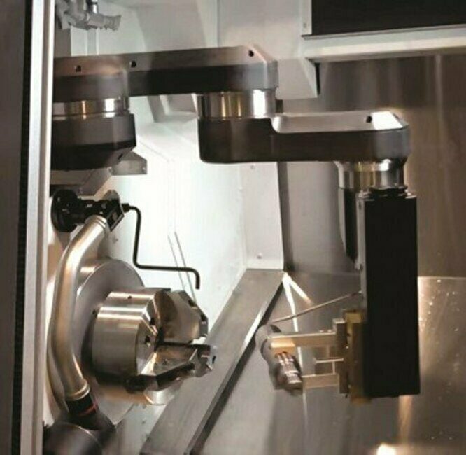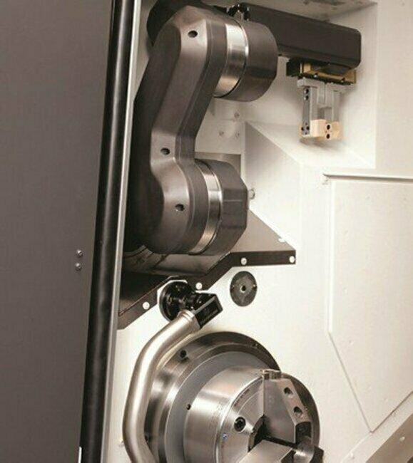 Základní funkcí robota je zakládání polotovaru obrobku do stroje, otáčení obrobku, je-li to nutné, a vyjímání hotového obrobku. Robot spolupracuje se stohovacím zásobníkem přistaveným ke stroji, ze které¨ho vyjímá polotovary a ukládá do něj hotové obrobky. Na jednom z obrázku je robot v pozici vyjímání částečně opracovaného obrobku ze sklíčidla. Následně dojde k otočení obrobku a k novému upnutí za opracovanou část.