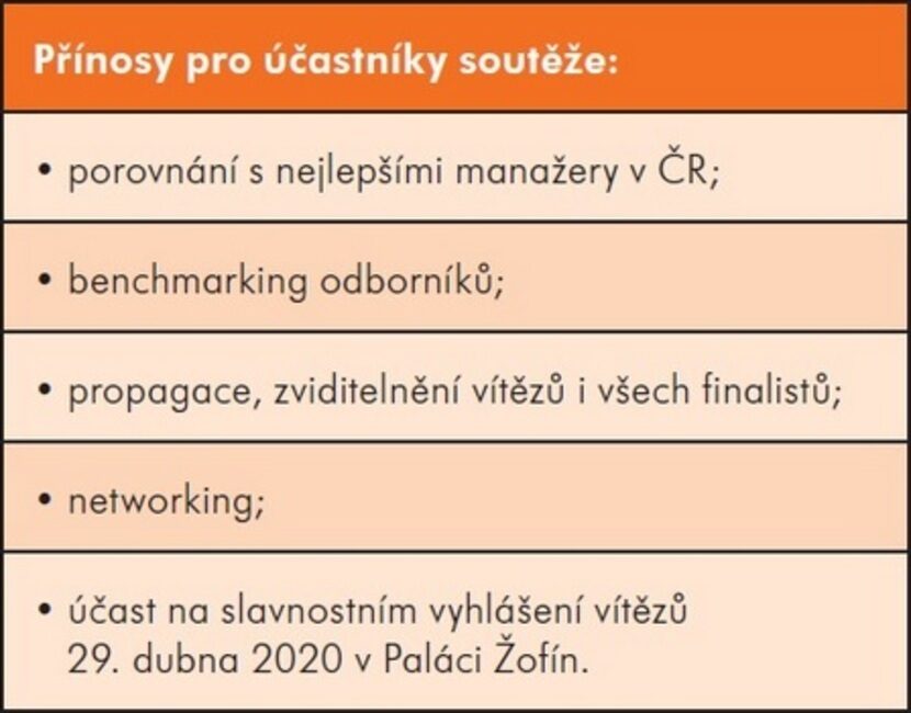Základních kategorií, do nichž se zájemci mohou hlásit do poloviny března, je 10. Zvláštní cenou je Inovace pro udržitelný rozvoj. Nynější soutěžní kolo je pojato inovativně a nabízí vedle klasických oborů již zmíněné kategorie Manažer digitálního věku, Vizionář či Manažer malého a středního podniku.