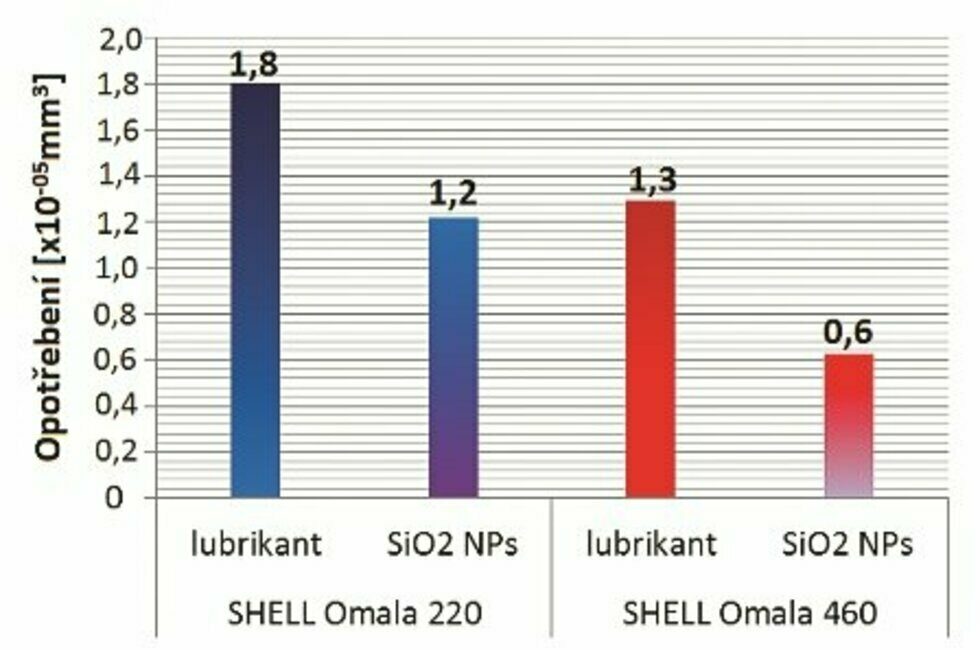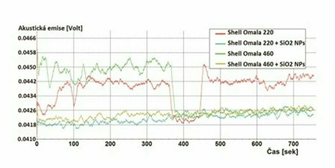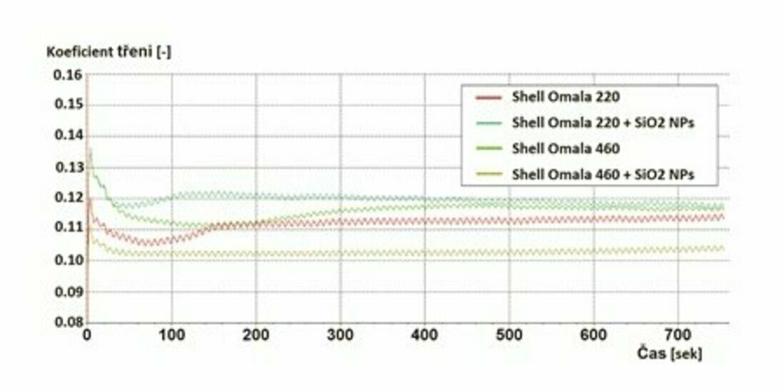 Provedení tribologických experimentů mělo za cíl porovnání součinitele tření neaditovaného lubrikantu a lubrikantu s nanočásticemi oxidu křemičitého (SiO2). U lubrikantu Shell Omala 220 s přidanými nanočásticemi byla na začátku experimentu hodnota součinitele tření o 10 % vyšší než při použití lubrikantu bez aditiva. Ke konci měření se hodnoty u lubrikantu s a bez aditivace k sobě přiblížily. U lubrikantu s názvem Shell Omala 460 se po přidání nanočástic SiO2 hodnota součinitele tření v průběhu experimentu snížila o 12 % a zachovala si svou hodnotu až do konce (obr. 2).
