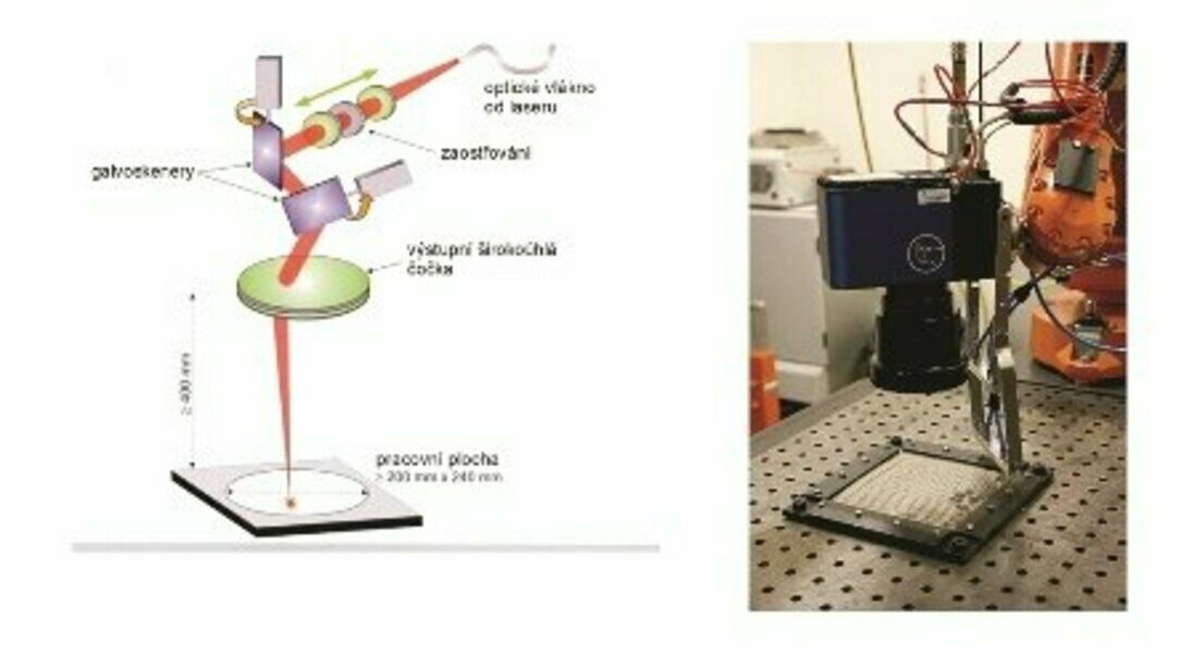 Pro experimenty demonstrující možnosti pokročilých metod byla použita sestava s výkonovým vláknovým laserem IPG YLS 2000, robotem ABB IRB2400, který nese vlastní skenovací hlavu Arges Fiber Rhino (obr. 1b). Součástí je speciální F-theta objektiv s pracovní vzdáleností 203,4 mm a pracovním prostorem cca 215 x 215 mm.