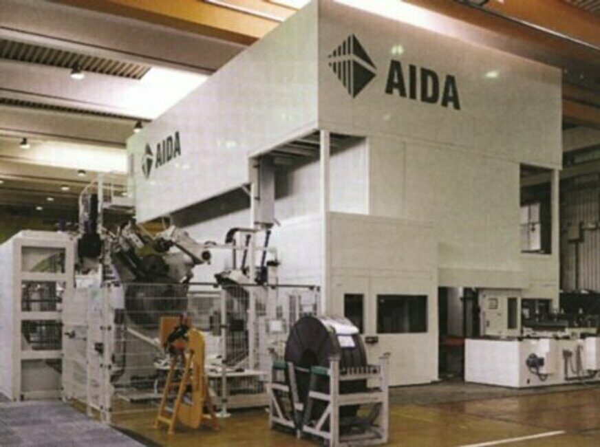 Transferový lis s klasickým pohonem od firmy Aida TMX-S3-19000-600-100(S). Lisovací síla 19 000 kN, pohon se setrvačníkem, velikost stolu: 6 000 mm x 1 000 mm, počet stupňů: 12, vzdálenost stupňů: 500 mm.