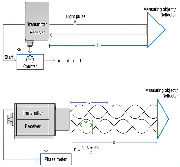 Senzory z řady optoNCDT ILR104x pracují na principu měření doby letu laserového paprsku (nahoře), zatímco senzory optoNCDT ILR3380 fungují podle principu fázového porovnání (dole). (Zdroj: Micro-Epsilon)