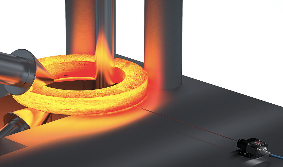 V metalurgickém průmyslu se kovy zpracovávají při teplotách až 1 100 °C. Průměr prstence během válcování lze průběžně monitorovat senzorem ILR3800-100-H, který zvládá extrémní teplotu měřeného materiálu. (Zdroj: Micro-Epsilon)