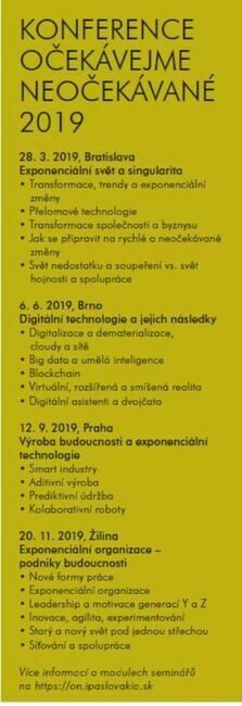 Prof. Košturiak: Na seminároch budú diskutovať najlepší experti z Českej a Slovenskej republiky, ktorí majú reálne skúsenosti s exponenciálnymi technológiami v biznise. Medzi účastníkmi sú majitelia firiem, manažéri pre priemysel 4.0, inovátori a priemyselní inžinieri, vrcholoví manažéri medzinárodných firiem, IT experti a vizionári, experti zo siete našej Podnikateľskej univerzity, Nadace ZET, Red Button, Inovato a ďalší. Pre účastníkov chceme pripraviť digitálne podklady, s ktorými by mali po návrate z každého seminára usporiadať workshop vo svojej vlastnej firme a pripraviť si stratégiu postupných krokov do budúceho sveta. Môžu to zvládnuť sami alebo im v tom pomôžeme. Veci sa menia veľmi rýchlo a treba konať. Najväčším rizikom je dnes strach z rizika, experimentov, vykročenia do nekomfortnej zóny nepoznaného. V každej firme máme dnes firmu starú, ktorá obsluhuje našich zákazníkov a zarába peniaze, ale musíme budovať aj firmu novú, ktorá bude fungovať odlišne a bude zarábať peniaze v budúcnosti. Som prekvapený, koľko ľudí na vysokých miestach v podnikoch má len veľmi povrchné znalosti o trendoch, ktoré prichádzajú. Zmeny budú rýchle a neočakávané, podobne ako cunami a mnohé firmy dopadnú tak, ako nič netušiaci turisti na pláži. Na druhej strane vidím už dnes, že tí, ktorí pochopili zmeny vo svete biznisu, si už dnes vytvárajú konkurenčný náskok v znalostiach, ktoré sa nedajú vyčítať z kníh, kúpiť alebo nainštalovať.