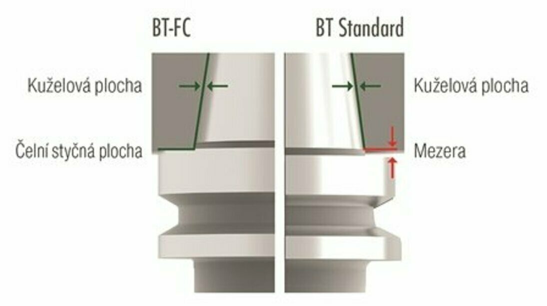 Upínače BT-FC zaručují maximální procesní spolehlivost a především delší životnost nástrojů. Jedná o upínací systém s dvojitým kontaktem, dvojitou fixací upínače ve vřetenu, kdy standardní upnutí kuželové styčné plochy je doplněno čelním kontaktem na čele příruby upínače. Jednou z hlavních předností systému BT-FC je vyšší tuhost při obrábění. Důvodem je kompletní plošné opření upínače nesoucího nástroj, z čehož plyne podstatně lepší pevnost při radiálním zatěžování. Takzvaný „Face Contact“ ve spojení s upnutím na kuželové ploše brání odchylkám a současně tak umožňuje vyšší přesnost a kvalitu opracování. Čelní styčná plocha působí rovněž proti vzniku vibrací, které například při rychlostním obrábění HSC způsobují postupný otlak v oblasti kuželu strojního vřetena a nástrojového držáku. Čelní dodatečné upnutí tudíž značně prodlužuje životnost strojního vřetena, nástrojového držáku i nástroje samotného.