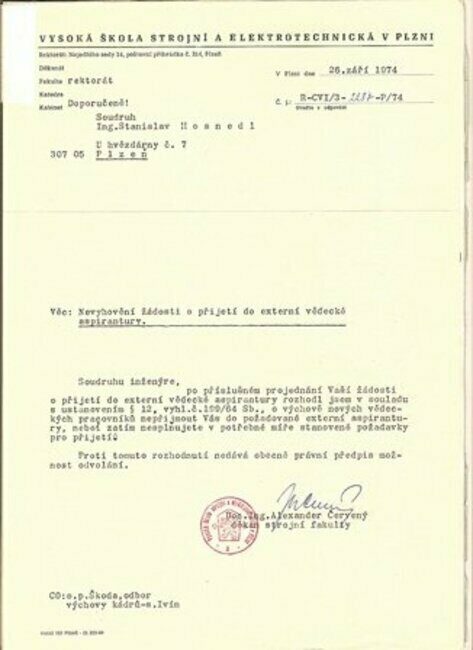 V roce 1974 působila normalizace v tehdejším Československu zásadním způsobem. Opakované zamítnutí žádosti o přijetí do externí vědecké aspirantury. Odvolání se proti tomuto rozhodnutí Ing. Hosnedlovi příslušný právní předpis neumožnil.