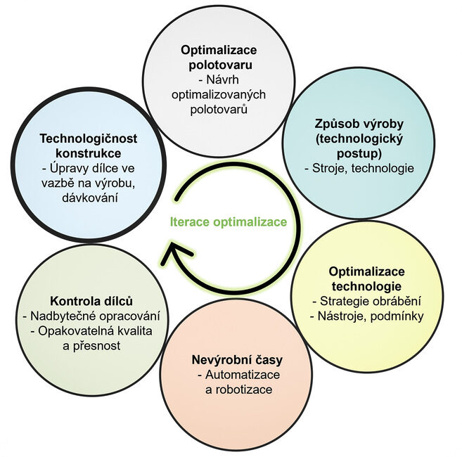 Druhá fáze obsahuje metodiku optimalizace, znázorněnou na druhém obrázku. Parametry optimalizace mohou být snížení ceny, zvýšení produktivity nebo snížení emisí CO2. Metodika zahrnuje komplexní přístup od redesignu dílce po vyhodnocení konečné kontroly. Metodika je následně přenositelná na dílce z podobnostních skupin. Prvním krokem je seznámení s výrobními postupy. Následně probíhá diskuze s konstruktéry a montáží. Konkrétním výsledkem může být zvětšení minimálních rádiusů dílce, což umožní volit tužší řezné nástroje a produktivnější řezné podmínky. Dalším krokem je zaměření na polotovar a např. na přesnost odlitků s vazbou na vstupní cenu a na přínos ve snížení výrobní ceny. Poté je navržena modifikace technologického postupu ve vztahu k výrobním strojům, kapacitám a technologiím. Obvykle jde o porovnání mezi použitím jednoho multifunkčního stroje a použitím dvou strojů samostatných – frézky a soustruhu. V závislosti na modifikovaném technologickém postupu je pozornost zaměřena na to, jak lze jednotlivé operace optimalizovat. Volbou vhodných řezných nástrojů v kombinaci s vhodnou CAM strategií je možné výrazně zkrátit výrobní časy. K tomuto kroku jsou často využívány pokročilé softwarové nástroje jako např. digitální dvojče stroje a procesu. Velký potenciál v sobě skrývá i předposlední krok, jímž je studie implementace automatizace AVO a AVN, jakož i robotizace. Tento krok s sebou často nese velké investiční náklady, a proto je nutné důkladně posoudit návratnost investic, a to již skrze širší portfolio vyráběných dílců a s využitím dat z ERP. Posledním krokem je kontrola. Nutnou podmínkou je technicky správně vyrobený dílec, mnohdy však dochází ke zbytečně vysoké jakosti dílců i v případě, kdy to nemá smysl. To si lze představit na dílci s předepsanou drsností Ra 3,2 µm, který je obráběn na drsnost Ra 1,6 µm u nepohledové části. V takových případech vzniká prostor pro optimalizaci technologie a pro další následné úspory. Podobně je tomu i v případě rozměrových tolerancí, kdy lze po domluvě s konstrukčním oddělením nalézt prostor pro snížení požadavků, aby výrobu bylo možno zjednodušit a zlevnit.