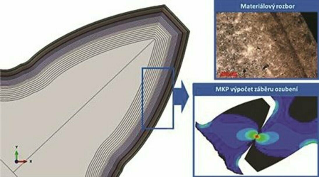 „Slupky“ tvrzené vrstvy MKP modelu simulujícího záběr ozubení s materiálovým rozborem a MKP výpočtem napětí při záběru.