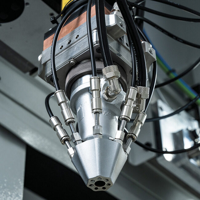 Konstrukce laserového nástroje: Povlakový materiál se přivádí ve formě prášku a na povrch součásti se natavuje pomocí laserového procesu. (Zdroj: Emag)