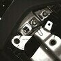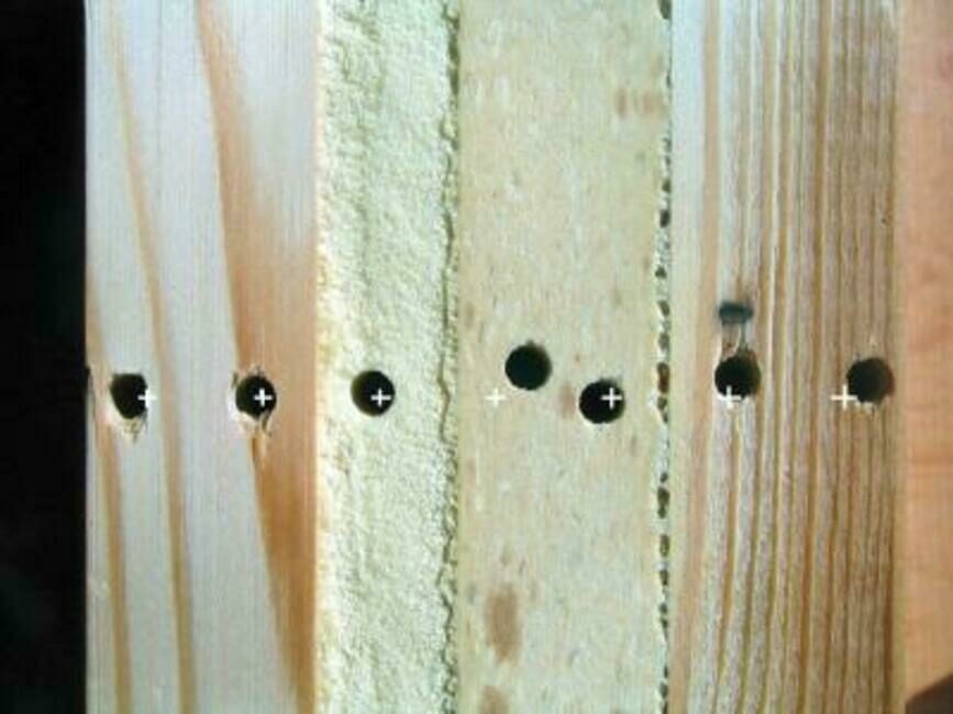 Vrtané otvory na výstupu z materiálu (bílé křížky značí požadované osy otvorů).