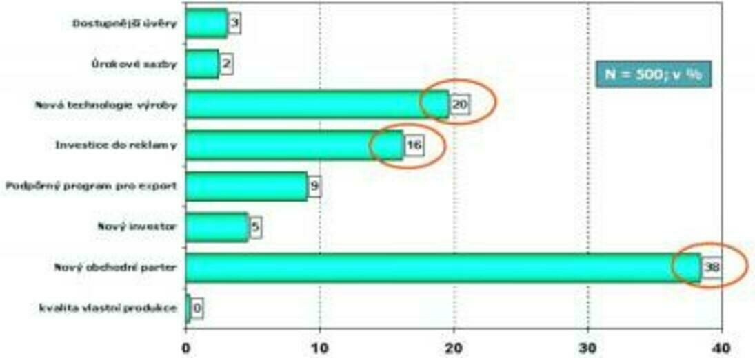Exportérům nejvíce pomohlo v posledních 12 měsících získání nových obchodních partnerů v zahraničí (38 %, podzim 2008 36 %), technologické inovace (20 %, podzim 2008 18 %), investice do reklamy (16 %, podzim 2008 11 %) a podpůrné programy pro export (9 %, podzim 2008 7%).