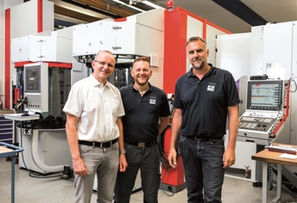 Zleva: Dipl.-Ing. (FH) Rainer Gottschling, generální ředitel, Sven Faas, plánování/programování/péče o zařízení, a Alexander Roeth, technický provozní vedoucí, všichni z firmy Kappler, před flexibilní výrobní buňkou.