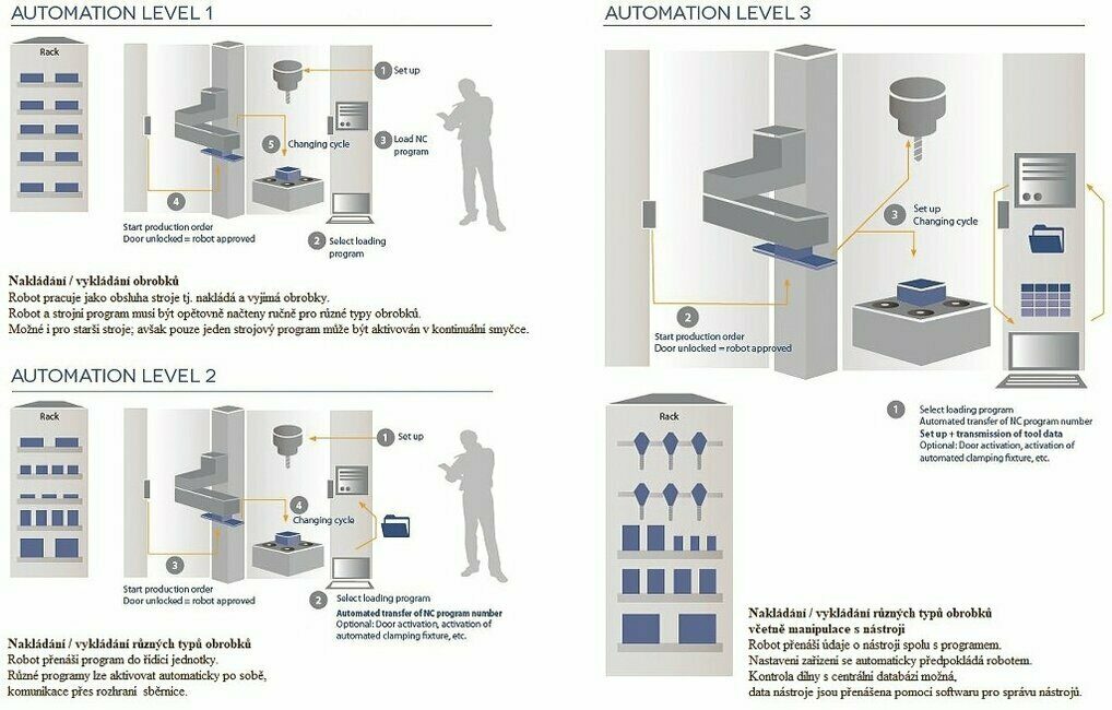 Důvodem, proč uživatelé strojů automatizují své výrobní stroje, je vyrábět komponenty efektivně, vyloučit vliv nestálého lidského činitele, tj. vyrábět s nejnižším možným počtem zaměstnanců a tím vyrábět opakovaně i spolehlivě. Dále je snahou významně zvýšit efektivní využití provozního času stroje v průběhu dne, v noci a o víkendech. Pro realizaci těchto úkolů byly vyvinuty následující prostředky průmyslové manipulace nasazované u výrobních a zejména pak obráběcích strojů: