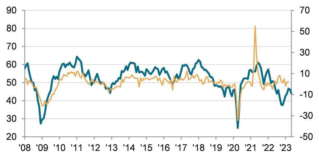 Podnikatelé byli sami opatrní také v prognózách, a omezili vstupní výdaje a pokračovali ve vyskladňování zásob. Očekávání, ač mezi nesilnějšími v tomto roce, zůstala historicky slabá, protože firmy nevidí známky konce současné situace. Podle naší aktuální předpovědi bude růst průmyslové produkce v roce 2023 stagnovat.