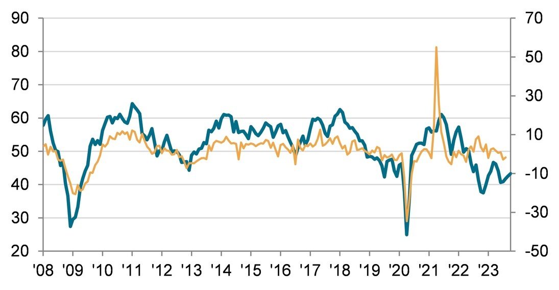 „V prostředí českého zpracovatelského sektoru se toho během října mnoho nezměnilo: výstup, nové zakázky i zaměstnanost dál klesly. Pracovních ztrát přibývalo a zaměstnanost klesla druhým nejrychlejším tempem od začátku pandemie. Slabá poptávka na domácím i zahraničním trhu spolu s nárůstem zpráv o rušení zakázek tížily očekávání a optimismus firem klesl na zatím nejnižší hodnotu v roce 2023. Nižší finanční zátěž spojená s omezováním výdajů výrobců a snahou dodavatelů zajistit odbyt se odrazila v největším snížení prodejních cen od poloviny roku 2009, protože i výrobci bojovali o pozornost odběratelů. Očekáváme, že Česká národní banka (ČNB) vzhledem k tlaku na snižování cen začne redukovat úrokové sazby na svém listopadovém zasedání.“